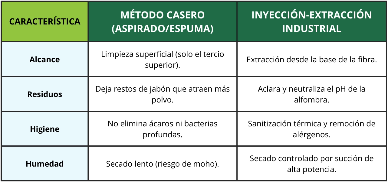 Sí. El lavado casero suele ser superficial y deja residuos de jabón que atraen más suciedad. El método profesional de inyección-extracción industrial penetra hasta la base de la alfombra, enjuaga los químicos y succiona el 90% del agua, eliminando alérgenos y bacterias que el aspirado común no alcanza.
